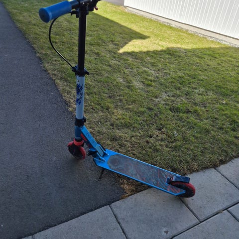 Kickbike i röd färg med T-styre och skumhandtag. Fotplattan har tryckt motiv. Två hjul och låg ståplatta anpassad för barn. Passar för lek och kortare turer på jämnt underlag utomhus.