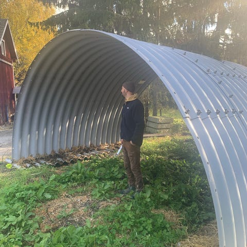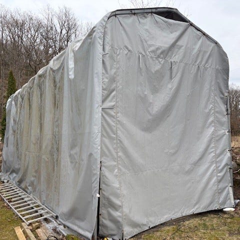förrådstält/ garagetält Presenningsgarage, 3,5x7,5x meter 500g/m2, Grå Slitstarkt garage med presenning för våra nordiska väderförhållanden ca 3/ 4 år gammalt i bra skick vid köp monteras det ner pris 5000kr