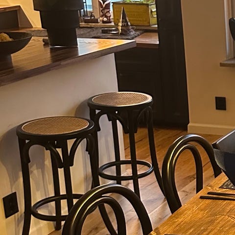 Två barstolar Miles, grå stoppad sits, vit trä. Höjd 110 cm, sitthöjd 82 cm. Nyskick.