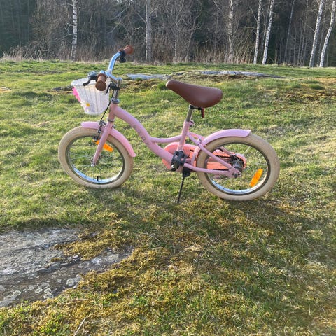 Väldigt fint skick. Stålhästen barncykel med 16" hjul. Cykeln har aprikos ram, ljusa däck och brun sadel och handtag. Utrustad med pakethållare bak, korg fram, stöd och reflexer. Alltid förvarad inomhus i förråd. Inga synliga skador eller slitage.