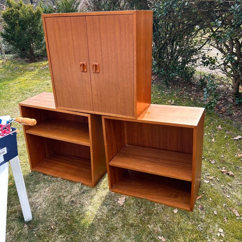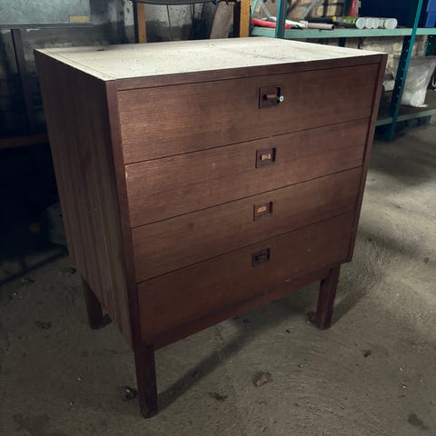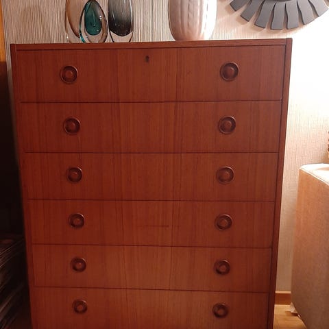 Fin liten byrå i vad som ser ut som teak. Visst slitage, ser inga större skador. Kan säkert bli jättefin med lite kärlek!