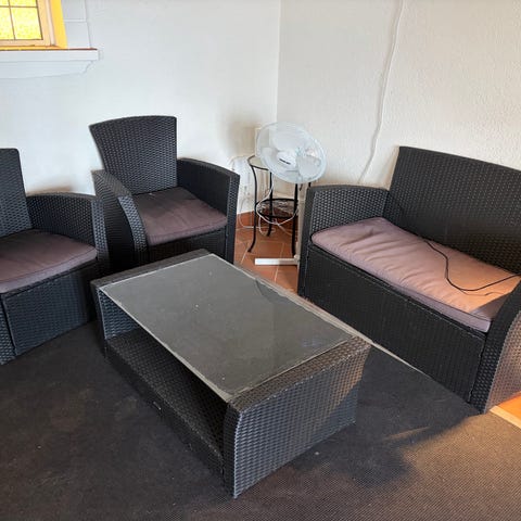 Utomhusmöbler i konstrotting. Två rymliga fåtöljer med tillhörande bord som har en glasskiva ovanpå. Säljes mot upphämtning.