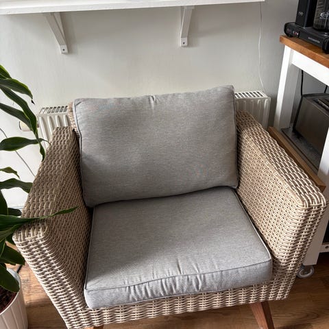 Fåtöljen har hög rygg och armstöd samt flätad design.