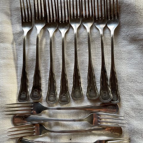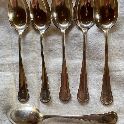 6 stycken dessertskedar i nysilver, märkta CGH (CG Hallberg), längd 18,5 cm