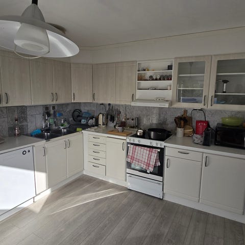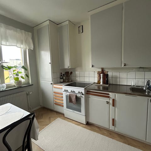 Skänker komplett kök med skåp, bänkskiva, diskho samt en fräsch gasspis och kylskåp.