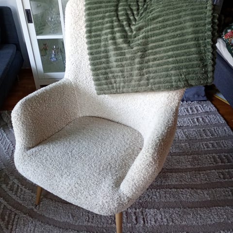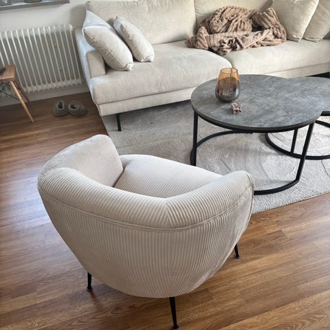 Säljer denna moderna och stilrena fåtölj klädd i mjuk bouclé-tyg i ljusgrå/beige färg. Stolen har ett elegant, minimalistiskt formspråk med svarta metallben och är i mycket gott skick.