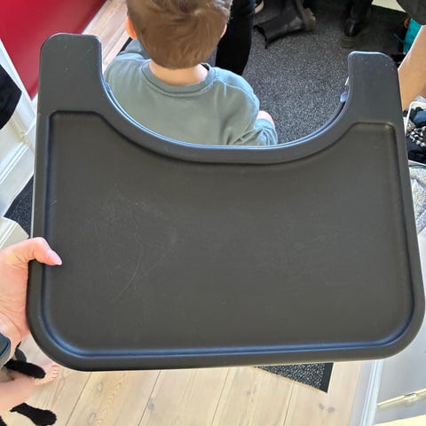 Stokke barnstol bricka i grå plast. Passar som matbricka eller lekbricka till barnstol från Stokke, nyare modell. Går att diska i diskmaskin.