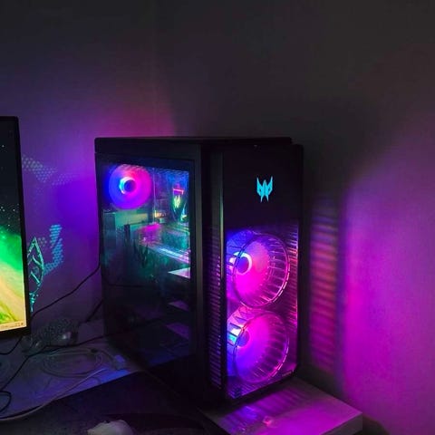 Acer stationär dator med svart chassi och sidopanel i glas. Datorn är utrustad med ett GeForce RTX-grafikkort enligt märkning på insidan. Chassit har front- och sidobelysning samt fläktar med LED-ljus. Den är köpt i slutet av december 2022, men har mest bara legat och knappast använts. Så skicket är fortfarande riktigt bra. Nypris 18000