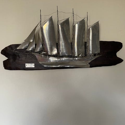 Fantastiska äldre svalor i mässing. Fem vackra unika äldre svalor i mässing. Fäst på vägg med hängen på baksidan. Kan behöva putsas upp. Den största har en vingbredd på 45 cm och den minsta har en vingbredd på 17,5 cm. Sällsynt fynd, då dessa storlekar med den största är väldigt unika. Pris: 4500 kr. Finns att hämta i Enskede Gård.