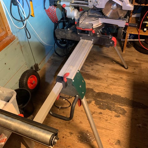 Kap- och gersåg med stativ. Sågen är monterad på ett hopfällbart stativ med stöd för längre arbetsstycken. Maskinen har roterbart bord för geringskapning och justerbart anhåll. Utrustad med dammpåse och elanslutning via kabel. Lämplig för kapning och geringssågning av trä och liknande material i verkstad eller på byggarbetsplats.