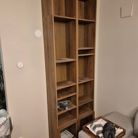 IKEA hylla i svart färg med flera öppna hyllplan. Passar för förvaring och exponering av till exempel böcker, dekorationer eller mindre föremål i vardagsrum, sovrum eller hall.