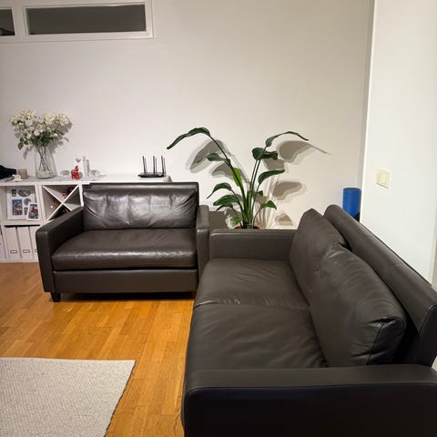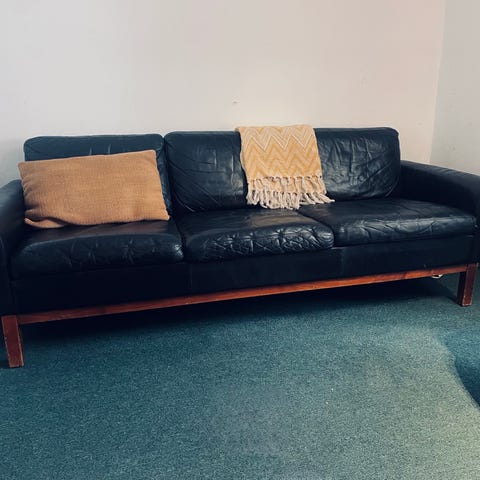 Underbar liten skinnsoffa från 60-talet säljes. Osäker på tillverkare men sannolikt svensktillverkad.