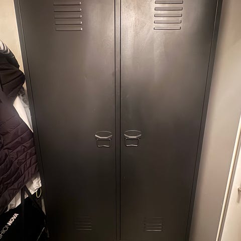 Garderob i svart lackad plåt. H 180 B 90 D 40 cm