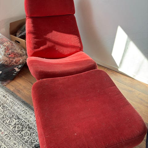 Inbyggd fotpall med höj och sänkbart nackstöd samt en ledad rygg som följer ryggens form när du lutar dig tillbaka.