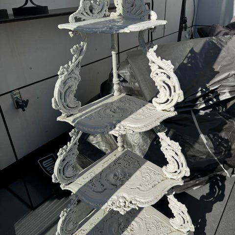 Piedestal smide gjutjärn omkr. 1900. Höjd ca 94, bredd/diameter 55 cm. 4 hyllplan. Utomhus patina. Bruksslitage. Transport till centrala Sthlm. möjlig efter överenskommelse, + 300kr. Se mina övriga annonser.