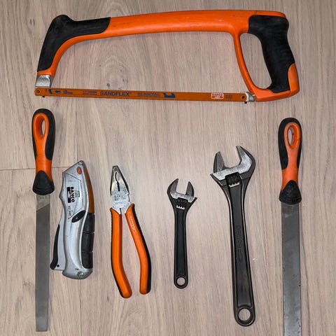 Rasp, håltagare, polygrip, skyddsglasögon, skruvmejslar, hovtång, skiftnyckel
