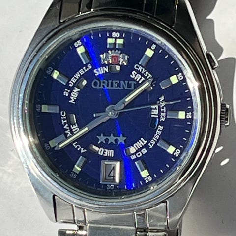 Klockan är i nyskick – aldrig använd. Skyddsplast finns kvar och originaltag sitter kvar. Levereras som fullt originalset med original Orient-box – perfekt som present.