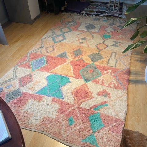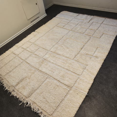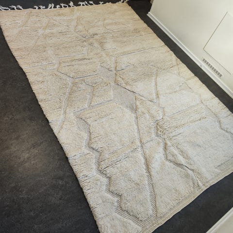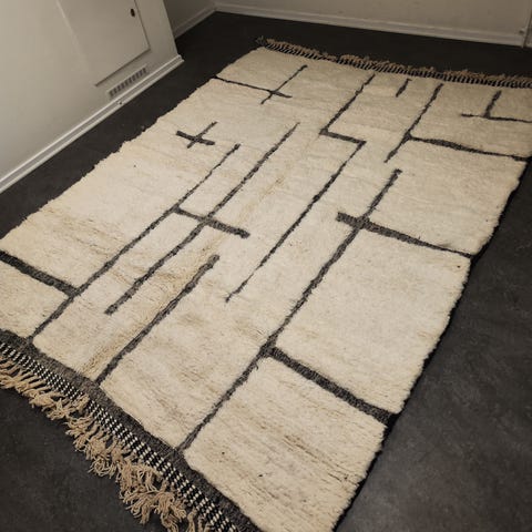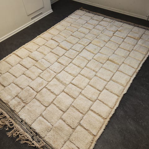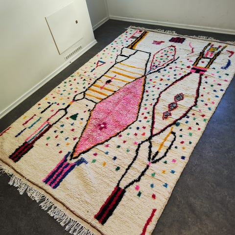 En Beni Ourain-matta med olika färgpunkter är en handknuten ullmatta, traditionellt tillverkad i Marocko. Den har en mjuk och naturlig ullbas, ofta i en ljus/beige ton, och är dekorerad med små, oregelbundna färgpunkter i olika nyanser som röd, blå, gul eller grön. Dessa färgpunkter skapar ett subtilt och lekfullt mönster som bryter den minimalistiska basen, samtidigt som den behåller den tidlösa och naturliga känslan typisk för Beni Ourain-mattor.
