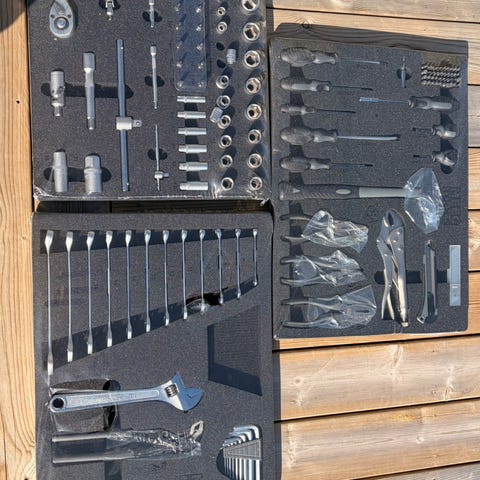 Förlängare och ledade kopplingar/knutar till samtliga storlekar. Chrome vanadium. Flertalet av delarna ser oanvända ut men förvaringsmärken finns.