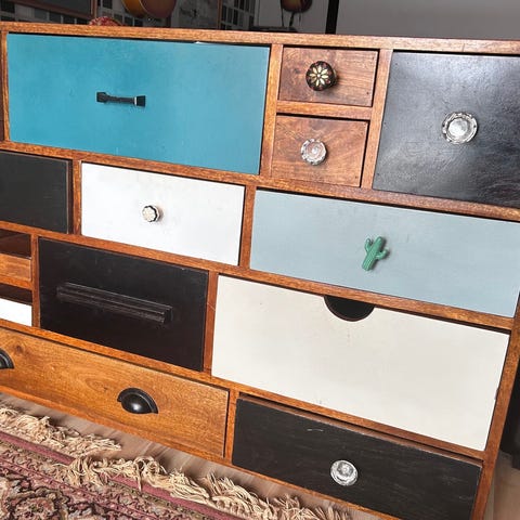 Vintage byrå i trä med flerfärgade lådor