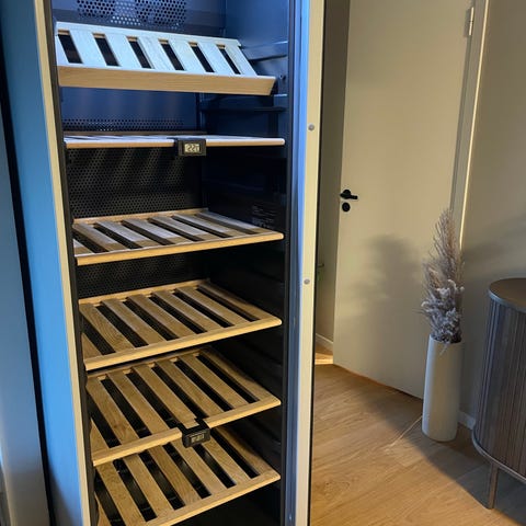 Säljer en vinkyl från märket Vinoteca med plats för 165 flaskor. Har belysning och låsbar dörr. Storlek ca 60x180x68 cm (BxHxD). I väldigt gott skick.