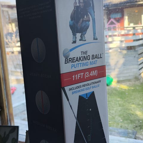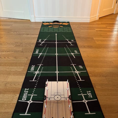 Golf puttingmatta för inomhusbruk, grön färg. Mått cirka 300 x 100 cm med tre hål i ena änden. Mattan kan rullas ihop för enkel förvaring och transport. Avsedd för puttträning och övning av precision hemma eller på kontoret.
