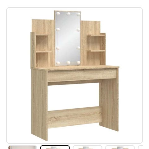 IKEA skrivbord i vitt med lådor. Bordet har svängda ben och en rektangulär bordsskiva. På bordsskivan står fristående lådmoduler med utdragslådor, invändigt klädda med randigt mönster. Möbeln är formgiven av Harri Koskinen och lämpar sig som arbetsbord eller sminkbord i exempelvis sovrum eller arbetsrum.