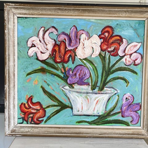Oljemålning med blommor och blad