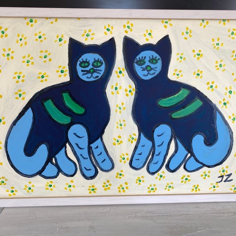 Oljemålning på duk. Föreställer ett mönster av rutor med blommor och blad i olika färger. Storlek 100cm x 100cm