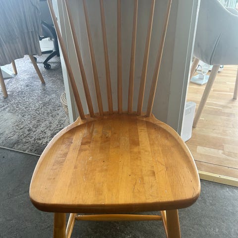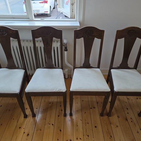 Fyra stolar stadiga men kan lyftas med ny klädsel. Går lätt att ta bort sitsen.