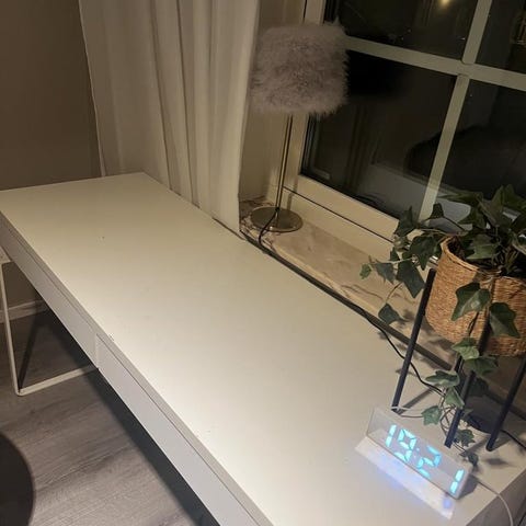 Bra säng med skrivbord under. Tror att ståhöjden är ca 170cm. Bra låda för exempelvis bokförvaring. på insidan