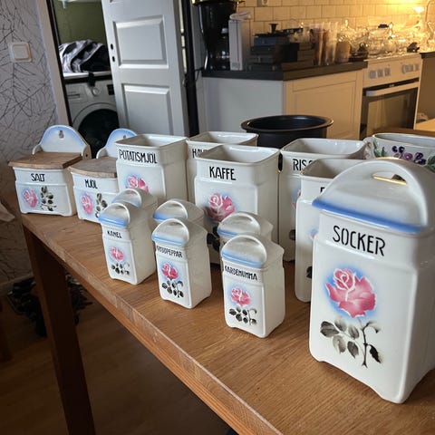 IKEA plåtburkar för köksförvaring. Set med flera runda burkar i röd färg med hjärtmotiv och lock. Lämpliga för förvaring av till exempel kakor, kaffe, te eller andra torra livsmedel i kök eller skafferi.