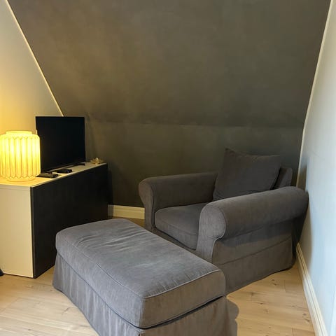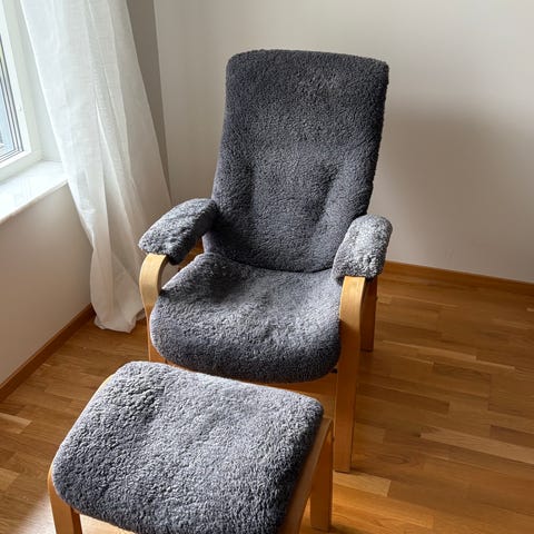 Fåtölj med elektrisk lyfthjälp för att enkelt komma i och ur. Fotpall med vippbräda för avlastning för ben och fötter.