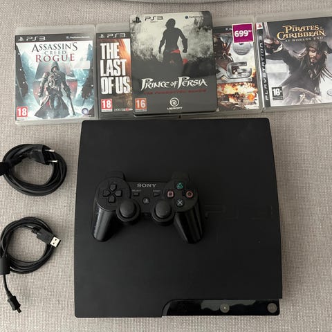 Sony Playstation 3 spelkonsol i svart färg. Konsolen levereras med två trådlösa handkontroller och strömkabel. På bilderna syns även tre spel i originalfodral som ingår tillsammans med konsolen. Passar för spel, filmuppspelning och annan underhållning som stöds av Playstation 3-systemet. 160GB minne.
