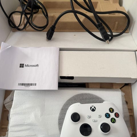 Microsoft Xbox Series S spelkonsol i vit färg. Konsolen levereras med tillhörande handkontroll, strömkabel och HDMI‑kabel enligt bilder. Kompakt digital spelkonsol avsedd för spel, streaming och underhållning. Manual och originalförpackning med inneremballage ingår enligt bilderna.
