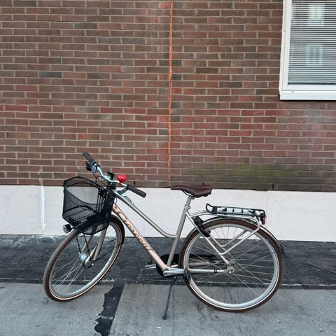 Crescent hybridcykel för kvinna med ramstorlek 51 cm och 28"/700c-hjul. Cykeln har röd ram med låg instegshöjd, raka styren och smala däck anpassade för stadskörning och pendling. Utrustad med handbromsar fram och bak samt sadel och pedaler anpassade för vardagscykling. Passar för cykling på asfalt och lättare grusvägar.