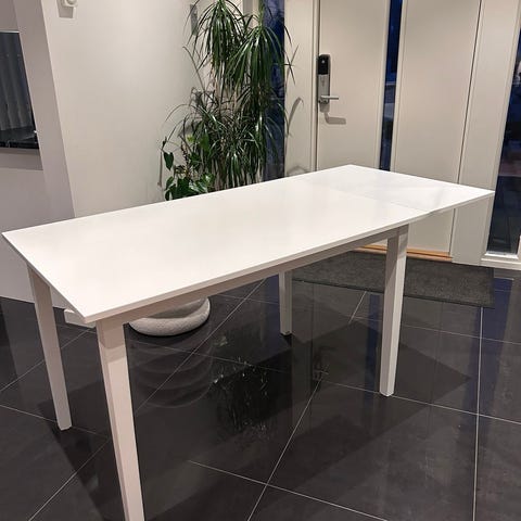 Vitt skrivbord från Jysk i fint skick. 2 utdragslådor. Litet skav på undersidan av låda, som knappt syns. Se bild