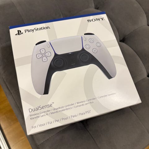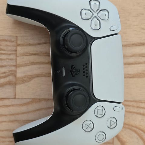 Sony DualSense handkontroll i vit färg. Trådlös spelkontroll avsedd för PlayStation 5 med inbyggd touchpad, styrspakar, knappar och triggrar.