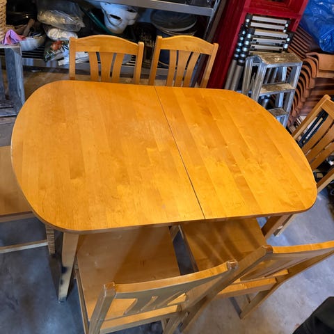 Furubord och fyra matchande trästolar. Bordet har en kraftig mittfot med stabil fotplatta. Stolarna har raka ryggstöd och ribbor i ryggen samt enkla sitsar i trä. Passar som matplats i kök eller mindre matrum.