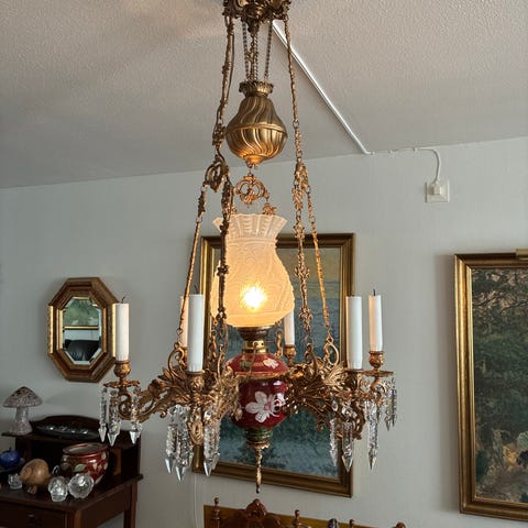 Säljer en fin majolika taklampa med fungerande el inkopplad och lampskärmar.