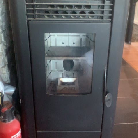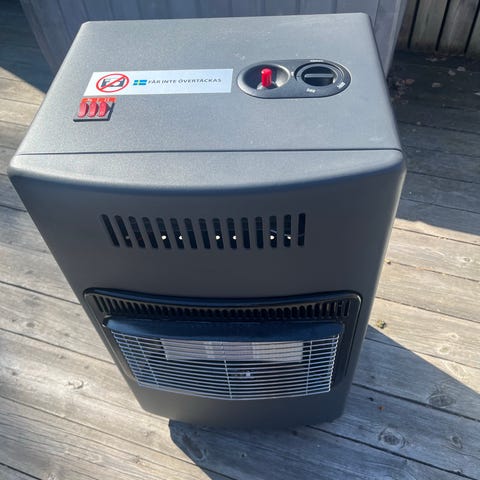 Gasolkamin med glasfront och dekorationsstenar. Fristående modell lämplig för uppvärmning av exempelvis altan, uterum eller andra väl ventilerade utrymmen. Utförd i metall med front i svart och sidor i ljus metall. Fönster i fronten ger insyn till brännare och stenar. Ansluts till gasolflaska enligt tillverkarens anvisningar.
