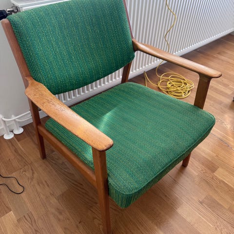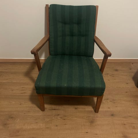 Fåtölj med grön tygklädsel och synlig trästomme. Rak rygg och sits med armstöd i trä. Passar som sittmöbel i vardagsrum, läshörna eller kontor. Populär Cocktailfåtölj på 50 talet.
