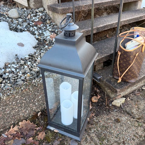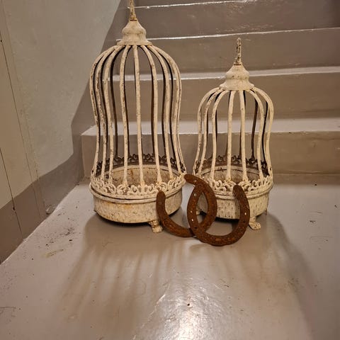 Set med två lyktor i vitt med glasväggar och detaljer i metall. Lyktorna har handtag upptill och plats för större blockljus. Passar för användning inomhus eller på balkong/uteplats, beroende på underlag och väderförhållanden.