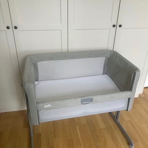 Obs! Säkerhetsremmar för att fästa crib i föräldrars säng saknas. Hjulen går att låsa så vi har använt sängen utan remmar.