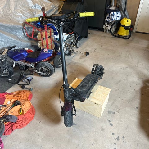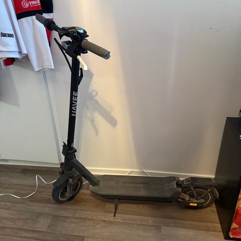 Elsparkcykel i vit färg med ståplatta och handtag med display och reglage på styret. Utrustad med framgaffel, bakhjul med bakljus och fotstöd. Passar för kortare pendlingssträckor och vardagsresor i stadsmiljö. Drivs av elmotor och har batteri integrerat i konstruktionen. Laddare och övriga tillbehör framgår inte av bilderna.