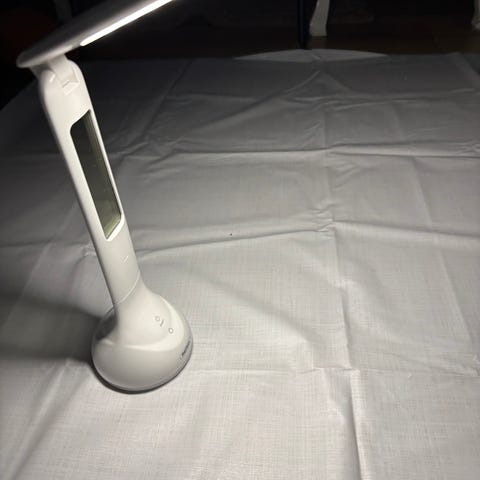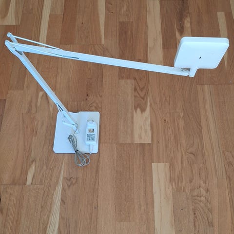 LED-skrivbordslampa med ögonskydd och modellnummer 1962. Lampan har dubbla lamphuvuden med 40 LED-lampor och drivs av 18650 litiumbatterier. Den erbjuder steglös dimning och tre färgtemperaturer (3000-6000K). Lampan har touchkontroll för att justera ljusstyrkan och färgtemperaturen. Den kan vikas 180 grader och laddas via USB-port (5V/1A). Effekt: 4W.