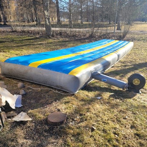 Skateboardramp. Bredd 214 cm. Längd 543 cm. Höjd 114 cm (200 cm inklusive räcken). Höjden kan enkelt ändras genom att montera de svängda sektionerna på lämpligt avstånd från mitten av rampen.