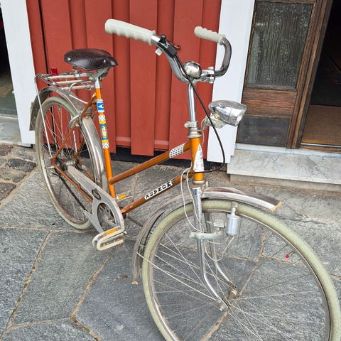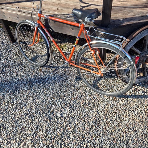 Crescent racercykel för herr med ramstorlek XL och 28"/700c-hjul. Cykeln har bockstyre, smala däck och växlar bak. Färgen är orange med vita detaljer. Utrustad med frambroms och bakbroms, flaskhållare på ramen samt bakskärm. Passar för pendling och landsvägscykling för längre förare som behöver en större ramstorlek.värdmestarcykel.TOPPENFIN