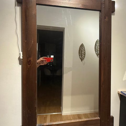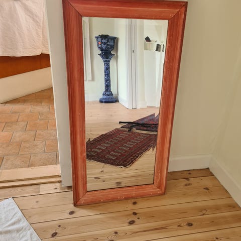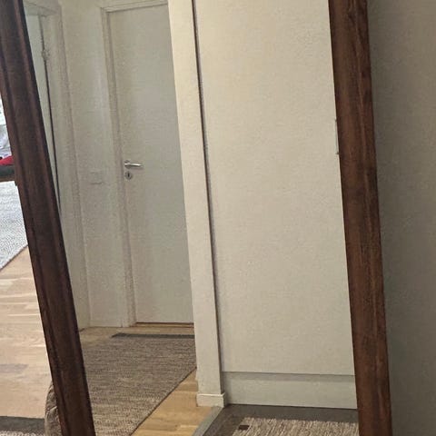 Jotex spegel med återvunnet trä i ramen. Passar perfekt i exempelvis hall, sovrum eller vardagsrum. Den är tung dock så det bör va en rejäl vägg man får skruvar upp den på.