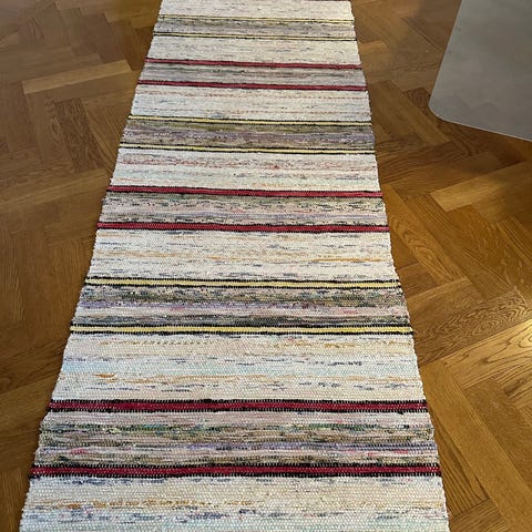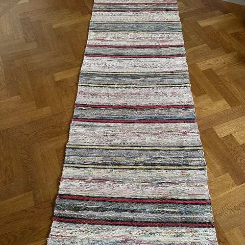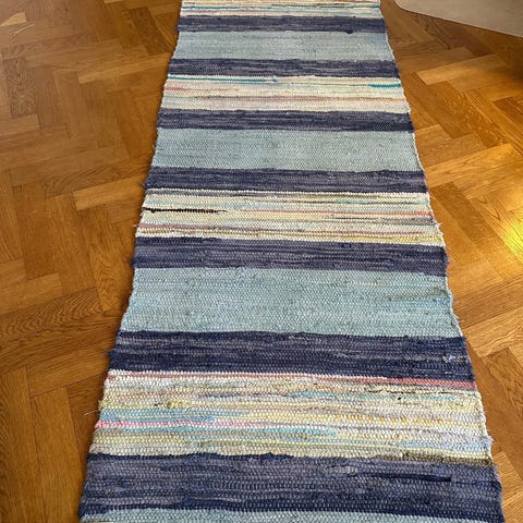 Fin lång hemvävd trasmatta, i bra skick. Ej tvättad, men jag kan inte se några fläckar.
